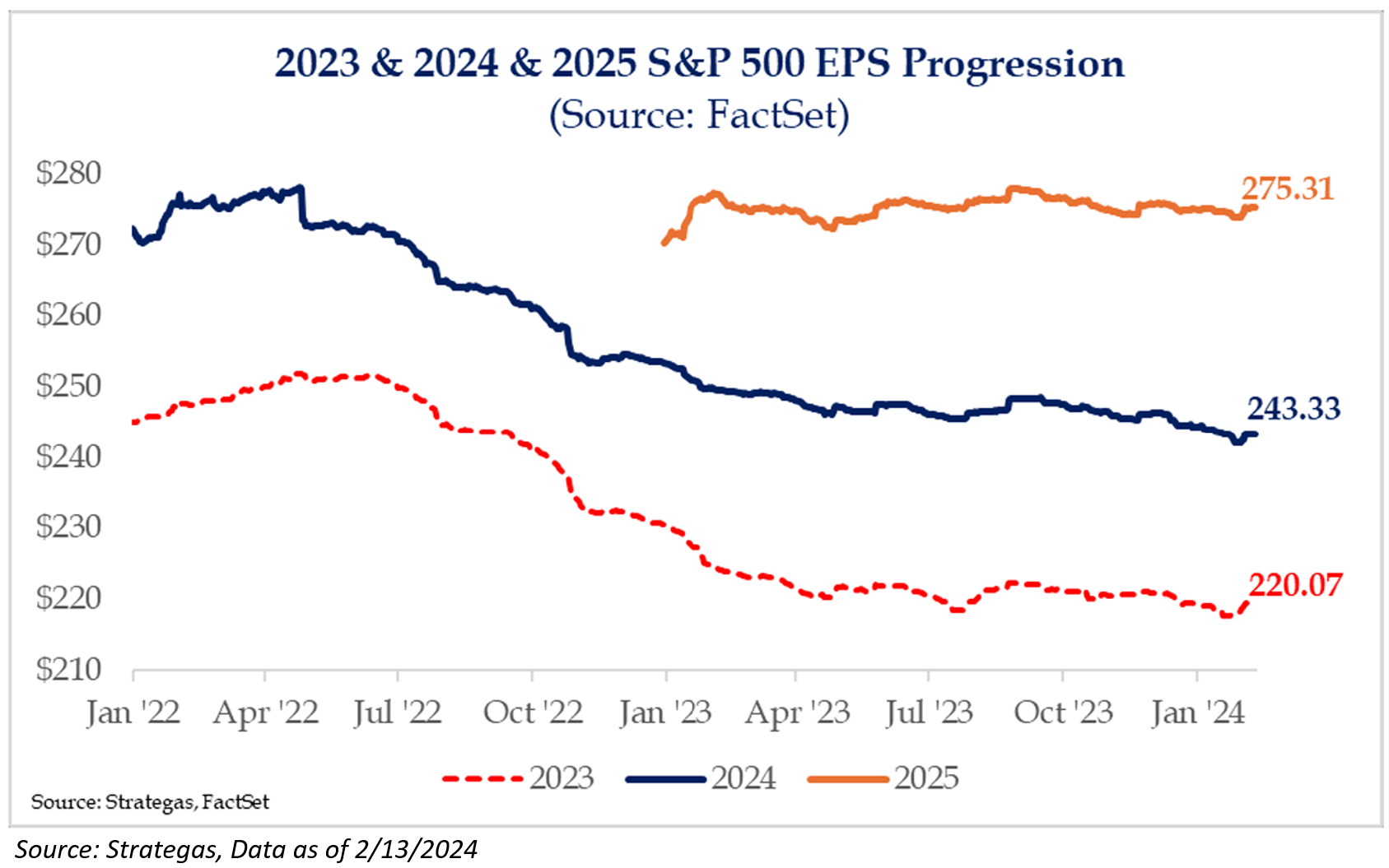 With the fourth quarter reporting season continuing to come in strong, 2023 EPS have ticked higher, but the growth rate for 2024 has suffered slightly with the lack of upward revision to 2024 figures. Growth now sits at about 10%, down from 11%. We suspect this growth rate will continue to slide with the traditional progression of EPS. It’s extraordinarily rare for large upward revisions to EPS figures later in the year. 2005 and 2006 are the prominent examples of this happening but it’s not the norm.