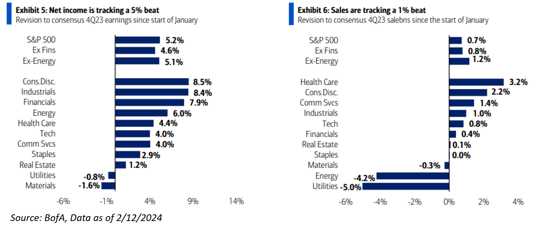 Q4 ’23 capital expenditures (“capex”) is tracking just +1% YoY (vs. +2% in 3Q) amid rate pressure. But 55% more companies are guiding above consensus on capex than below so far this earnings season (vs. 39% historical average). The aggregate capex guidance from 81 companies so far suggests healthy 7% growth in capex in 2024 YoY.