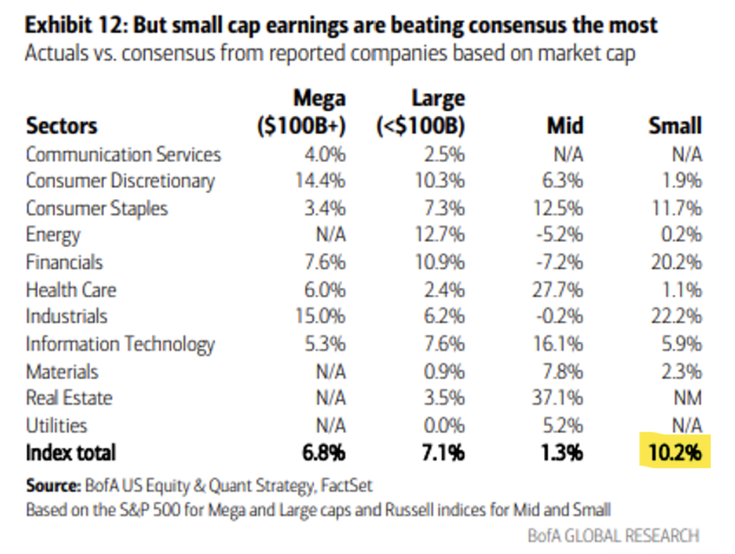 The Magnificent 7 (ex. NVDA that hasn’t reported yet) beat EPS by 7%, in line with the other 493. Mega caps ($100B+ in market cap) also beat by the same amount, while small caps are posting the biggest beat, +10%.