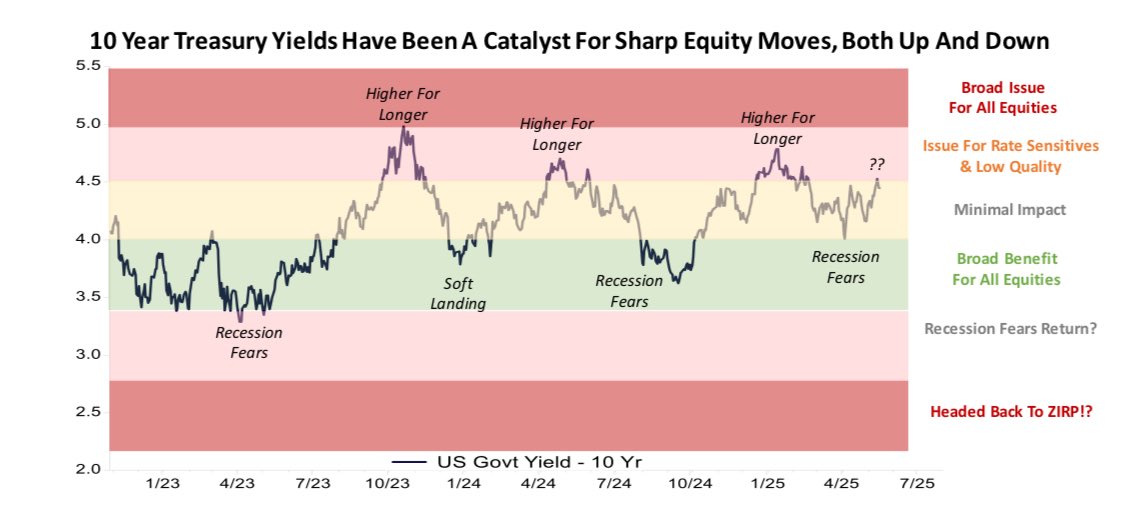Brad: The current rates yo-yo revolves around the ongoing news cycle of high tariffs vs. low tariffs, and how that might flow into the Fed’s rate plans