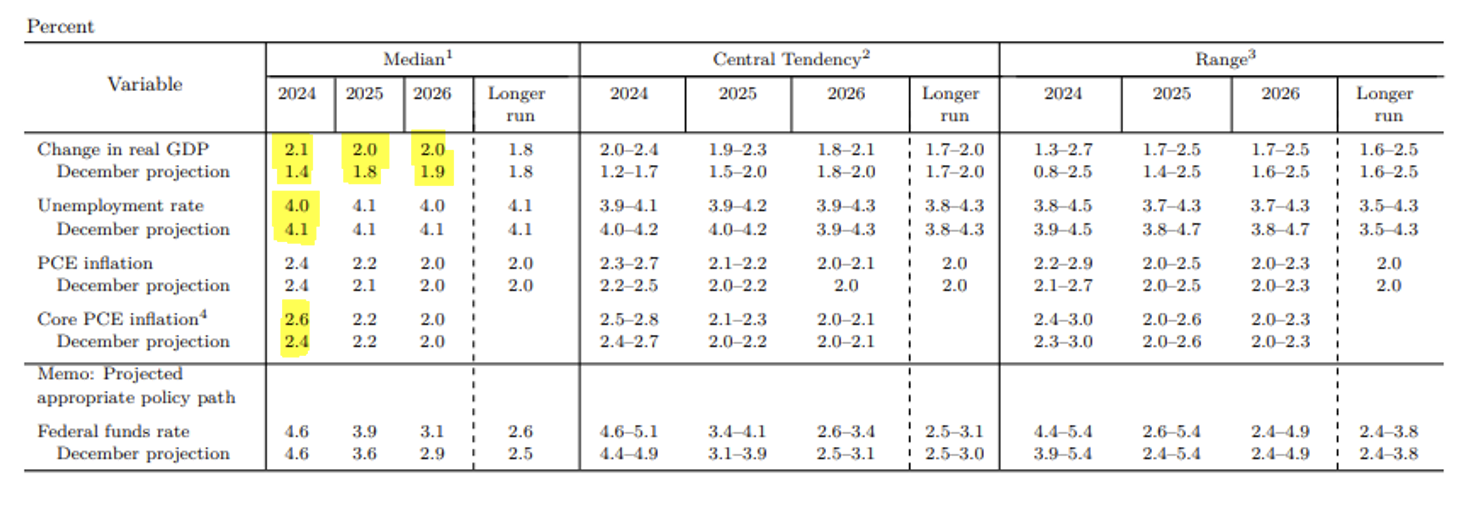 - The median 2024 Core PCE Inflation estimate was revised up 0.2% to 2.6% vs. 2.4% in December.