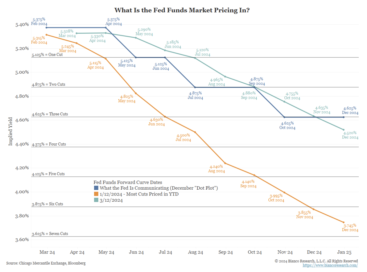 We’ve consistently put out this chart over the last several months as we believed the market was overly optimistic for rate cuts early in 2024. Currently, only three or four rate cuts are priced in for 2024.