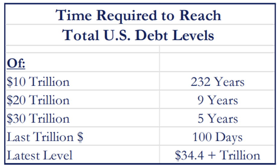 It took the United States 232 years to accumulate its first $10 trillion in debt, nine years to accumulate its second, and five years to reach its third. The trip from $33 trillion to $34 trillion in debt was a short one, requiring only three months, from September to December of 2023.