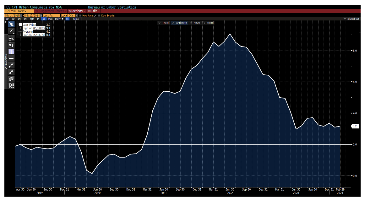 The U.S. CPI rose +0.4% m/m (3.2% y/y) & core (ex-food & energy) was +0.4% m/m (3.8% y/y) in February. The so-called “supercore” gauge slowed to 0.47% on the month, down from a red-hot 0.85% in January. The data is still uncomfortably high for the Fed.