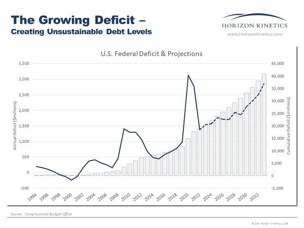 We’ve seen the annual deficit levels retreat from the highs reached during the COVID-19 pandemic, however, the cumulative deficit continues to mount. The Congressional Budget Office forecasts growing annual deficits for the next decade, meaning a higher debt burden for the United States.