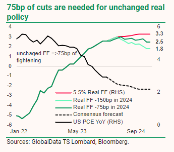 That said, cutting too much too soon risks re-acceleration and a reversal of inflation progress. Ultimately we believe the Fed will be more willing to accept a longer timeline to get to 2% to avoid recession. We see future cuts as being more aimed to correct an increasingly restrictive stance, and not in place to ease policy.