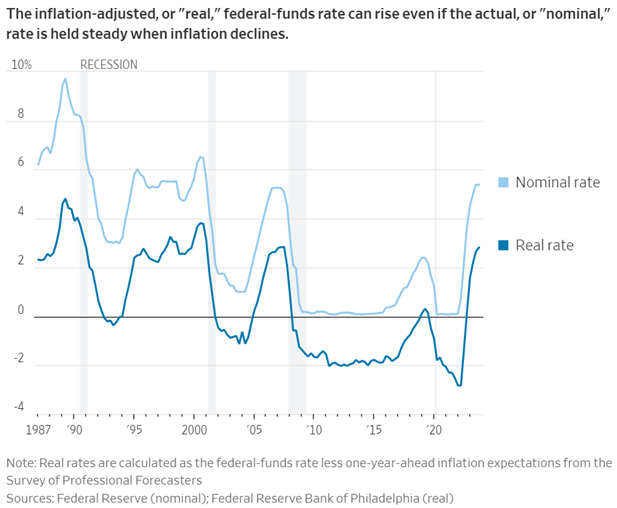 We continue to monitor the effects of holding nominal rates at current levels as inflation declines This lifts real rates and creates a slowing impact on the economy. How this relationship plays out will be pivotal to how the economy reacts in the future.