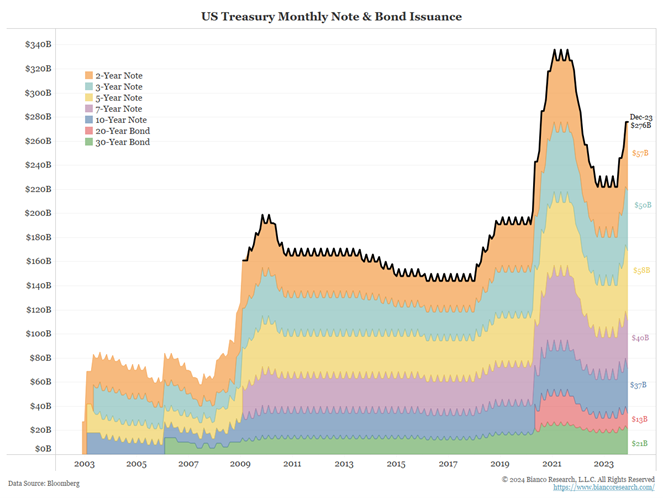 Wall Street was expecting somewhere around $795 billion in borrowing in the first calendar quarter of the year, but the Treasury announced $760 billion in borrowing needs, slightly lower than expected. Ultimately, this isn’t surprising given the elevated net worth of households, robust equity performance in 2023, and the approaching tax season.