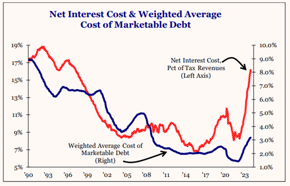 Taking that a step further, interest costs as a percentage of tax revenues are on the rise and the weighted average cost of the debt is rising. While not an immediate issue, it begs the question of who is going to buy all the debt to finance massive deficits, and at what interest rate level.