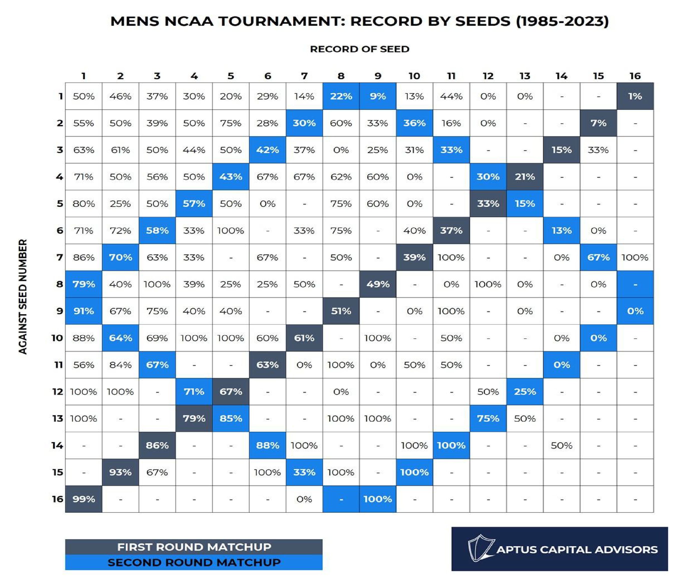 The same surprises hold up in investing. However, by making well-informed decisions with our handy table as a guide, rooted in historical performance, we can tilt the odds in our favor. The NCAA Tournament, with its unpredictability and excitement, serves as a metaphor for understanding risk, and probability, and improving the likelihood of achieving our desired outcome.