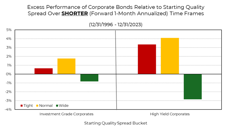 In contrast to longer-term trends, shorter timeframes revealed a (perhaps surprising) inverse relationship. Tight and normal spreads translated to higher relative returns than Treasuries over the shorter one-month forward horizon, while wider spreads led to poor relative short-term performance. This underlines potential justified risk compensation, especially given prevailing fundamental factors.