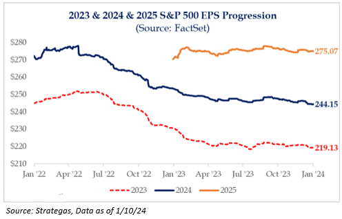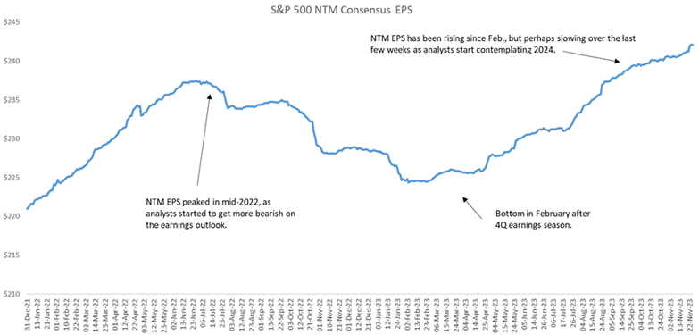 Last quarter marked the beginning of the earnings recovery with EPS growing 4% year-over-year (Q3 ’23 v. Q3 ’22). Below are the expectations for earnings in Q4 ’23: