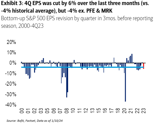 As one would expect, the Magnificent Seven (ex. TSLA, AAPL, etc.) are expected to drive a lot of the Q4 ’23 growth. The Mag 7 is expected to witness +48% earnings growth from a +12% revenue growth (that’s called operating leverage). Conversely, the average stock is expected to see EPS fall (~6%). But, on a positive note, earnings breadth (# of companies with positive EPS growth) is expected to improve for the third straight quarter. And, next quarter, the market does expect earnings for the average stock to inflect, accelerating +3% year-over-year in Q1 ’24.