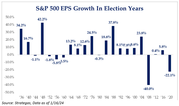 Now, here is an erroneous fact that simply shows that election years have no real effect on earnings: EPS growth, on average, is +8.5% during election years, slightly ahead of the LT average growth of +8.2%.