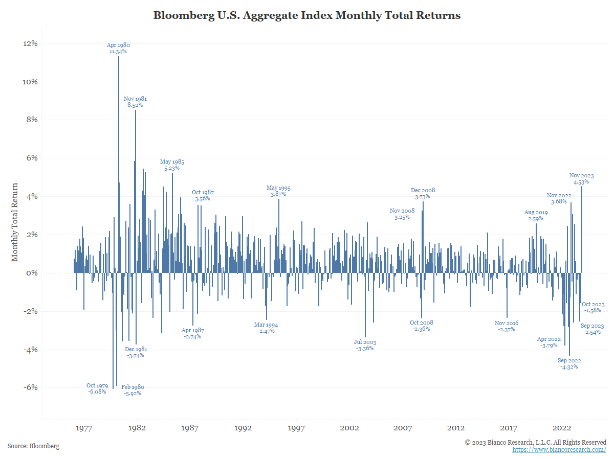 November proved to be one of the best months for the bond market on record. As the chart below shows, Bloomberg’s U.S. Aggregate Index posted a total return of 4.53% in November, its best month since May 1985.
