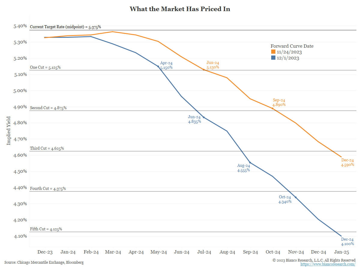 Fed expectations moved drastically last week. On Friday, November 24, markets were pricing in three cuts in 2024, with the first in June (orange). By Friday, December 1, the market was pricing in five cuts in 2024, starting around April (blue).