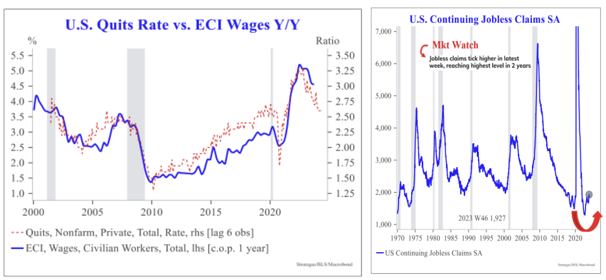 The quits rate in the Job Openings & Labor Turnover Survey (JOLTS) indicates that the U.S. labor market has been cooling off. This data tends to lead the Employment Cost Index (ECI) for wages Y/Y by roughly 6 months, which points to a continued slowdown into 2024. Bottom line, recent data reinforces the Fed pause.