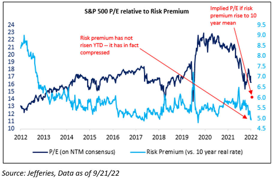 Many of y’all have heard my D + G spiel regarding the S&P 500’s P/E compressing from 21.5x (Dec ’21) to 16x currently, all while the risk premium has actually tightened. In other words, the cheapening of the P/E simply reflects the reality of higher real interest rates (10 year real from -1.1% in Dec ’21 to +1.2% currently) – not a higher risk premium. This places a lot of onus on earnings to continue to insulate the market.