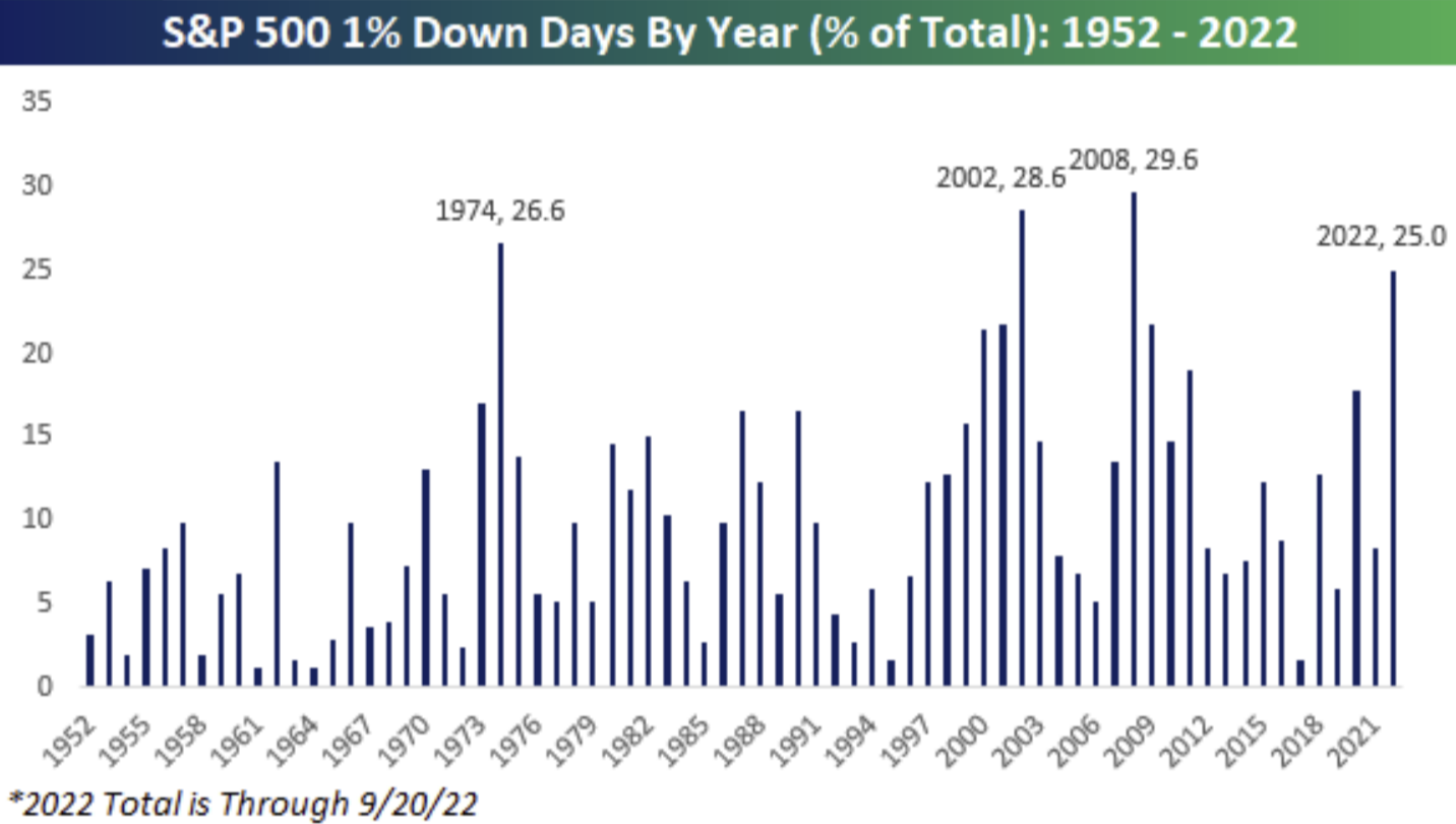 Year-to-date, we have almost seen an annual record of daily moves (%) greater than any other year since the early 1950s – 25% of the trading days thus far have had an intra-day swing of > 1%.