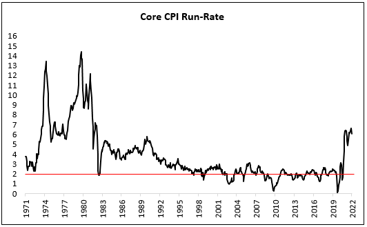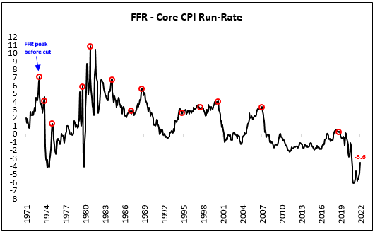 Monetary policy is ultimately transmitted through real rates (inflation-adjusted interest rates > 0%). Today, the 10-year real rate is 0.3% and the core CPI run-rate is 6.1%. The 25-year average 10-year real rate is around 1.3% and core CPI run-rate 2.2%. December 2018 marked the last time that the upper bound FFR was 2.50%. The 10-year real rate, then, was 1.0% with the core CPI run rate at 1.9%. Now is not the time for a Fed pivot!