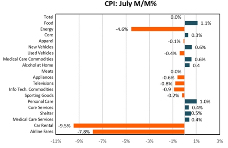It wasn’t all good news in the report, however. Gas prices did indeed decline during July, but YoY they are still up 44%. Food prices continue to rise with a 1.1% monthly gain vs. 1.0% in June and up 11% YoY. We aren’t out of the woods yet (sticky inflation components are still worrisome i.e., food, energy, and shelter) but the surprise to the downside was well received by the market (and US consumers) that the velocity of inflation is slowing.