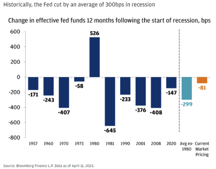 Investors continue to expect rate cuts far quicker than what the Fed is communicating. The market is pricing in ~80bps of rate cuts over the next 12 months. However, in the average recession dating back to the 1950s, the Fed has cut rates by an average of 300bps (excluding the 80s).