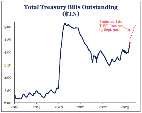 Approximately $400bn of the expected $1tn of T-bills have been issued over recent weeks. This level of debt issuance with a rising debt servicing cost is something we’ve not seen in 30 years. Prior to the debt ceiling, the TGA drain was offsetting a large chunk of the impact from QT.