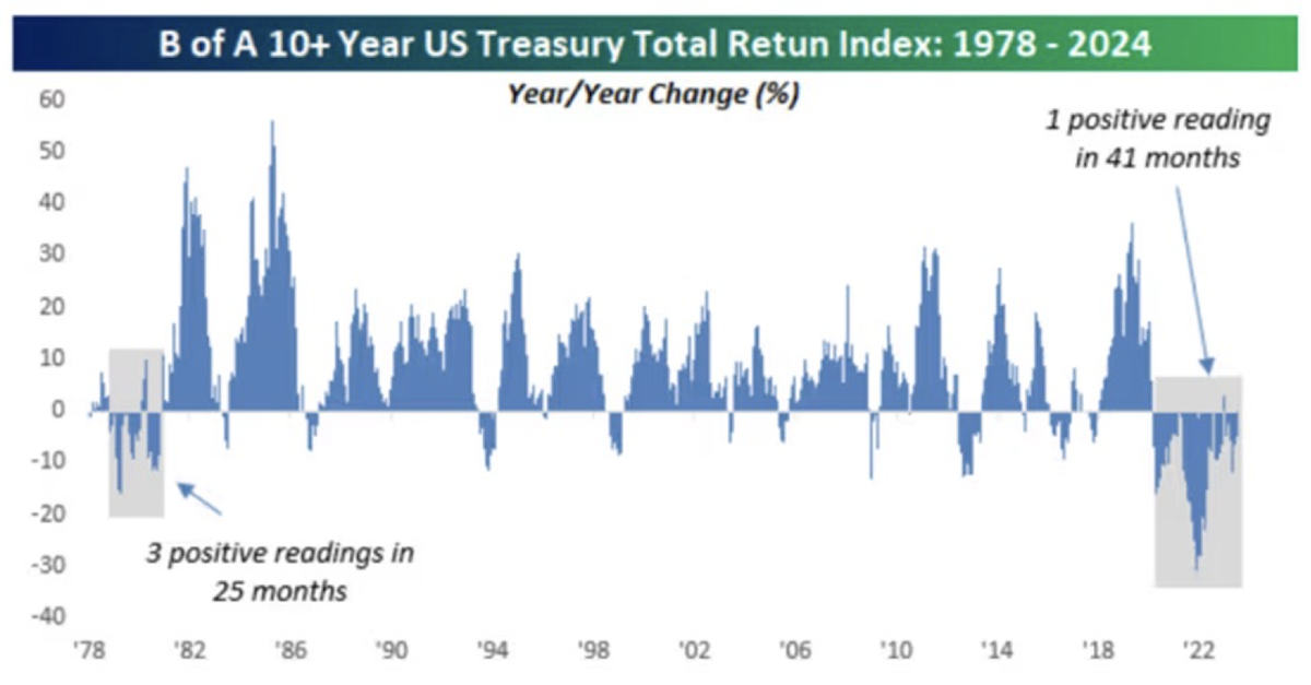 John Luke: The US Treasury Index has shown only one positive reading in the last 41 months. This is a rare occurrence, reminiscent of the late 1970s when there were only three positive months in 25. This trend highlights the persistent challenges in the bond market and the impact of prolonged low-interest rates