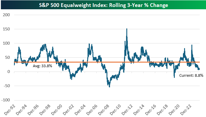 Beckham: The rolling three-year change in the S&P 500 equal-weighted index shows much lower-than-typical performance, despite the strength in the market cap-weighted S&P 500. This indicates that gains are concentrated in a few large stocks rather than being broad-based