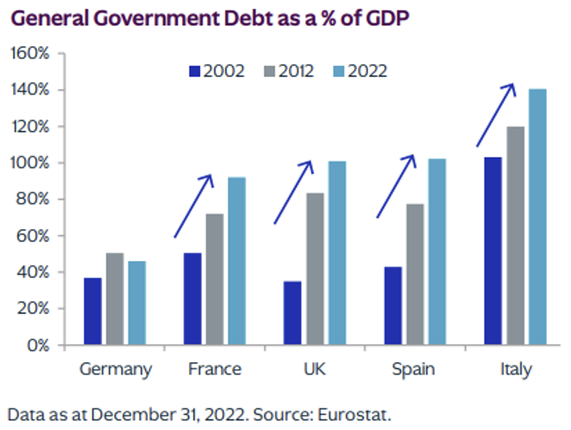 JD: Government debt as a percentage of GDP is increasing in nearly every country, except Germany. This rising debt burden poses long-term risks to economic stability and highlights the fiscal challenges faced globally