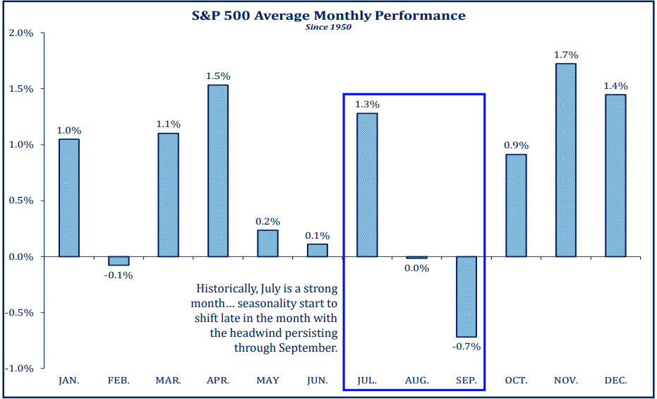 Dave: Shorter-term, July has been a strong month for the S&P 500 especially its first halves, followed by seasonal weakness in August and September. Investors should be mindful of these trends as they navigate the coming months
