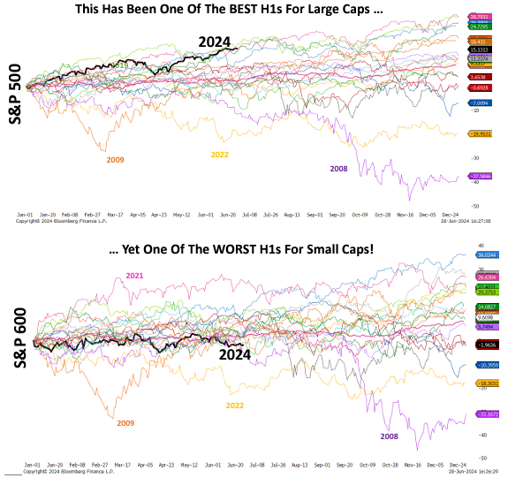 Dave: The S&P 500 had a robust first half of 2024, contrasting sharply with the S&P 600, which has struggled. This divergence highlights the strength of large-cap stocks and the challenges faced by smaller companies