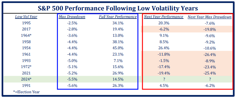 Brett: On the other hand, following years of low market volatility, the S&P 500 often exhibits mixed and generally weaker performance. This historical pattern suggests a cautious outlook for the near term