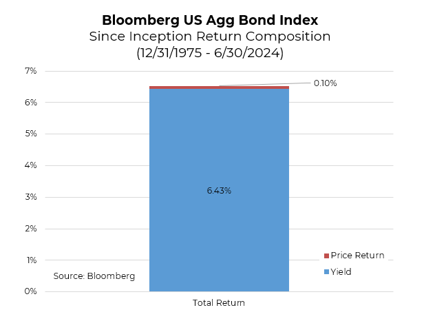 Brian: The recent underperformance of bonds has pushed the long-term dominance of yield over price changes in the Bloomberg Aggregate Bond Index, where 99% of long-run returns are now driven by yield, emphasizing the difficulty in achieving capital gains especially in a low-interest-rate or high inflationary environment