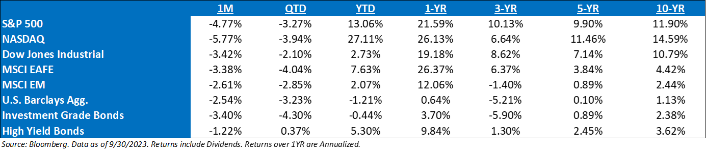 September ’23 Market Recap: As the weakest seasonal period for equities historically, September is doing what September does. The S&P 500 was down -4.8%. This was a stressful quarter for investors with few places to hide amidst the market pullback that weighed on all size and style boxes and most sectors. Noteworthy developments in the quarter include the sharp rise in interest rates to new multi-decade highs and a nearly 30% increase in oil prices. This combination reignited concerns about the health of the US consumer and the possibility of an upcoming recession. Quality themes continued to outperform amidst economic uncertainty.