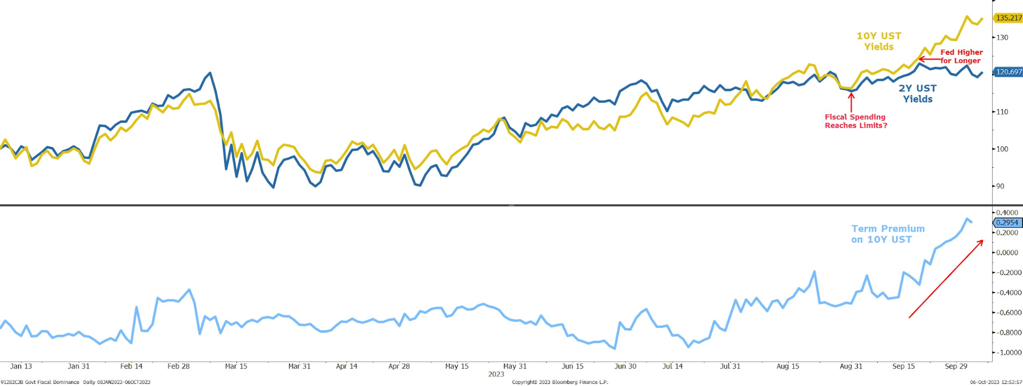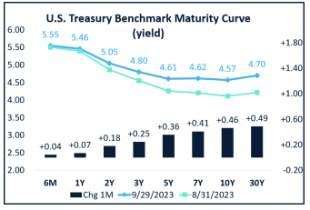 While front-end interest rates have been generally stable over the past several months on the expectation the Fed is close to ending its rate hikes, the longer end of the Treasury market continues to trade poorly with 10-year yields hovering near 5%.