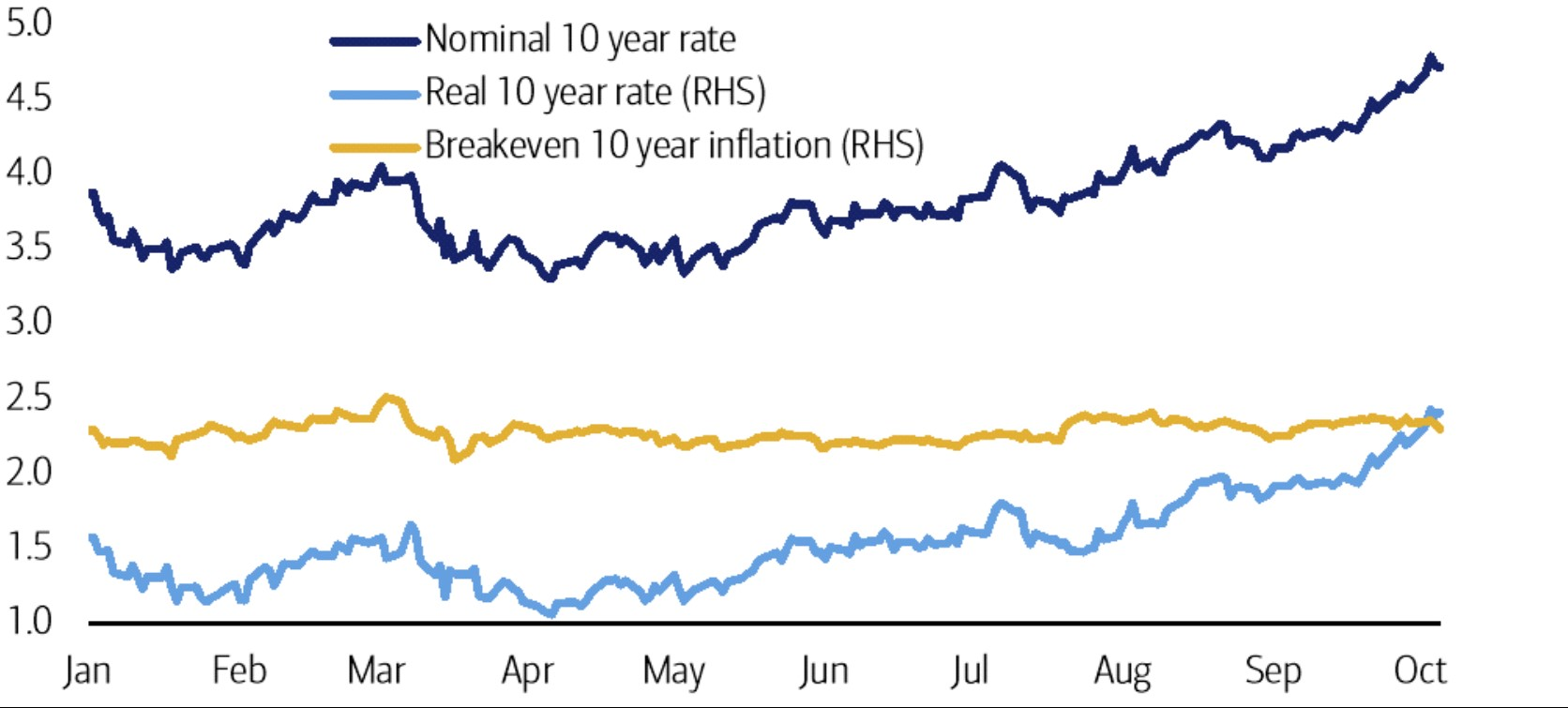 The US 10-year inflation breakeven rate has contributed only 10bps to the 135bp increase in nominal yields over the last five months which has been dwarfed by the 125bp jump in real yields to ~2.5%. Higher real rates should continue to slow the economy although it will take time for them to work their way through the real economy.