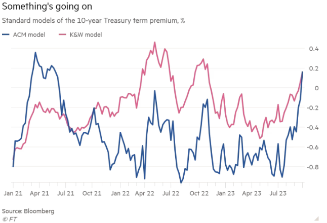 The term premium is unobservable and is mostly a guesstimate followed by economic models. Two of the more popular models indicate that the premium is up a lot recently.