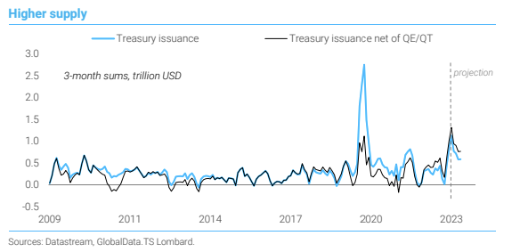 We’d note that this is the first time since 2017 that both models have shown a positive premium. We’d point to some of the issues above as to the reason for a wider term premium (stronger economic growth, question of a higher neutral rate, as well as inflation and growth uncertainty) but I think the other piece of the puzzle is the uptick in Treasury issuance. We will dive in on that a bit more below.