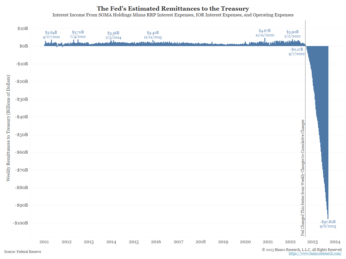 Once the Fed was no longer running at a profit, they changed their accounting to show the cumulative losses rather than continuing with weekly losses. As the chart above shows, they are now an estimated $98 billion in the hole.