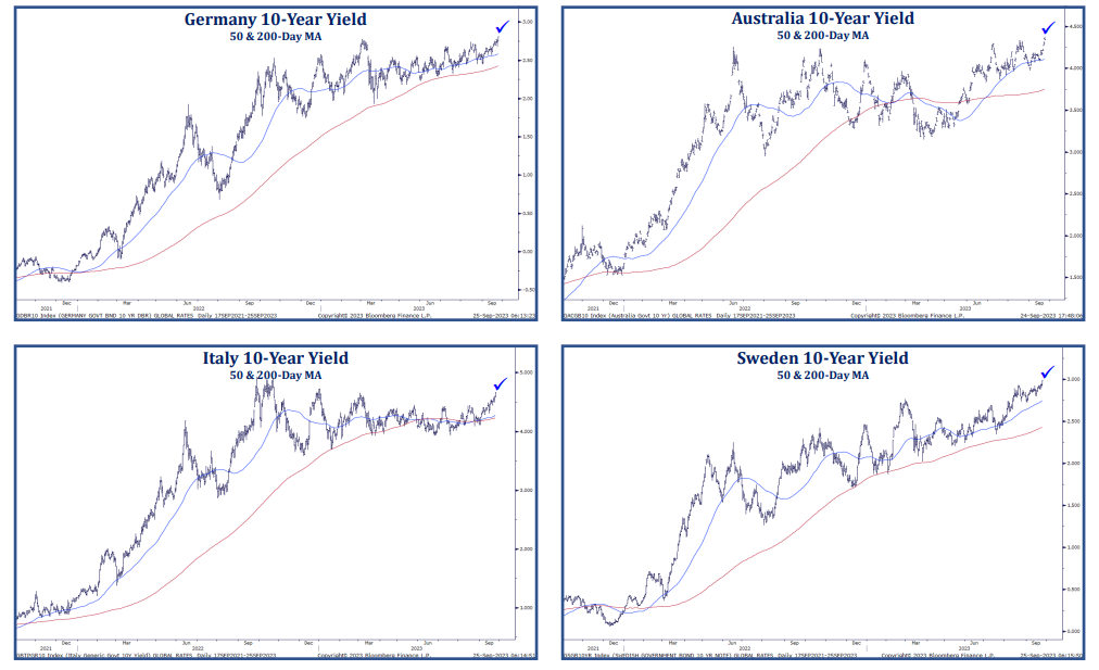 Echoing recent comments from a bond market update post, rising rates aren’t necessarily bad for markets but the pace at which they rise really matters (think back to the March banking crisis). On that note, in Q3, the 10-year Treasury is up nearly 70bps. The recent rise in rates has come quickly and deserves monitoring as we make new highs in long-term rates across most DMs.
