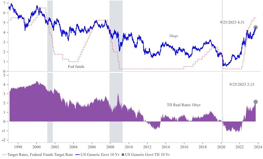Real rates continue to rise, as Fed policy remains high and inflation trickles lower. As the graphic shows, the last 10 years of real rates has been an anomaly compared to history.