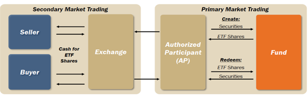Remember, the supply of an ETF is determined by demand…if demand exceeds supply, somebody has to create more supply and if supply exceeds demand, somebody has to destroy (or redeem) supply, that’s the role of an Authorized Participant (AP). They interact directly with the fund itself in the Primary market swapping securities for shares of the ETF depending on demand. OK…here is a picture of what I just said so we can catch our breath: