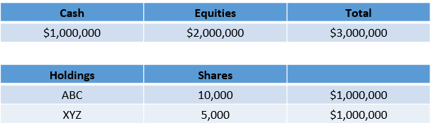 Introducing the 123 ETF. This ETF has a Net Asset Value (NAV) of $30 and has only 2 units (at 50,000 shares a piece) outstanding. That’s 100,000 shares outstanding for a total Assets Under Management value of $3 million. Below is a picture of this ETF and a breakdown of its holdings – again this is fake and simplified example to explain tax efficiency: