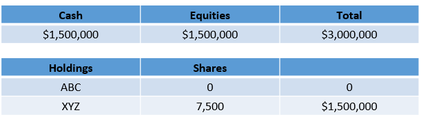 Now, post standard creation unit and the custom redemption, the fund is back to 2 units outstanding (no change there) and $3m total of AUM (no change there either). The weightings of the holdings have changed but the important part is ABC has been removed from the portfolio without being sold. It was removed via an “in-kind” exchange, which is a non-taxable event. Below is a picture of the fund now: