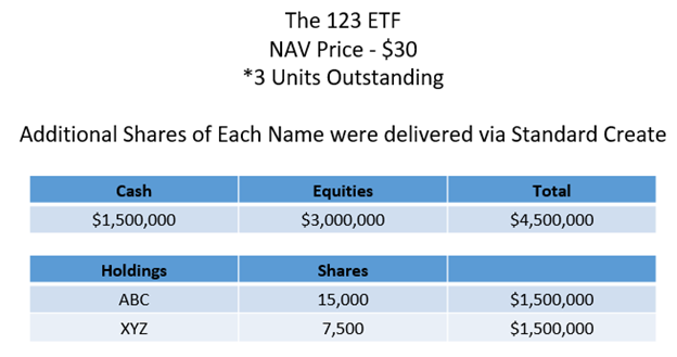 1 Unit = 50,000 shares An AP delivers the basket of Tickers and Cash and in turn receives back 50,000 shares of the fund. The Value of the “In-Kind” Transaction is $1,500,000 ($30 NAV x 50,000). This is a typical or standard Creation.