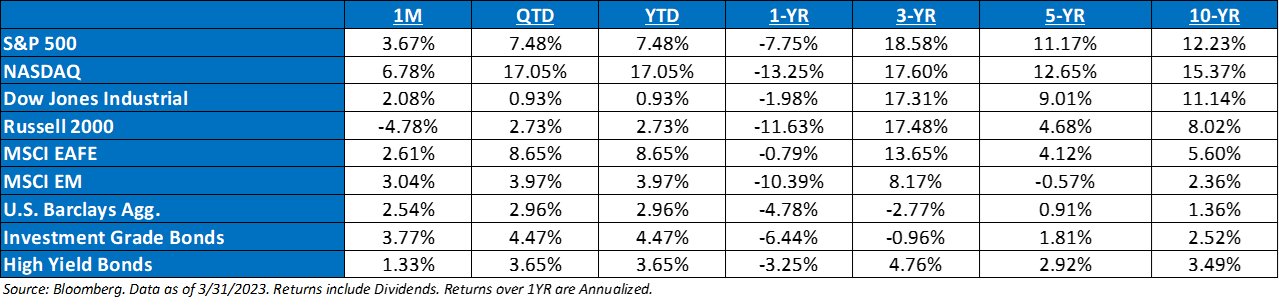 March ‘23 Market Recap; The S&P 500 ignored the fallout from banking woes and recorded a surprising +3.7% gain last month, leaving the index in positive territory for Q1 ‘23 (+7.5%). After a mid-month hike, the current Fed Funds rate (upper bound) is at 5% vs. 2-Year Treasuries at 4% – one of these assessments is wrong. Fed either needs to cut/pivot, or Treasury yields need to go higher. Equities seem to be trading in the former (pivot) camp. Investors now find themselves in a waiting game for evidence of a) recession showing up, b) inflation cooling off, and c) assessing how the events surrounding the mini-banking crisis have impacted corporate/consumer