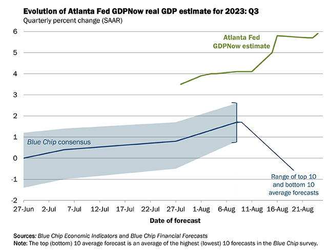 The Atlanta Fed’s GDPNow model estimate for real GDP growth (seasonally-adjusted annual rate) in the third quarter of 2023 is 5.9 percent on August 24, up from 5.8 percent on August 16.