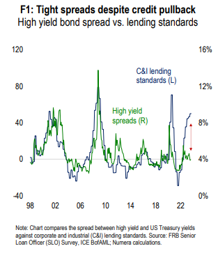Throughout the normalization, spreads have remained contained and high-yield paper has outperformed its investment-grade brethren given the strength of the economy. As the Fed’s inflation fight continues, we expect the tightening of lending standards to eventually spill over to the high-yield market.