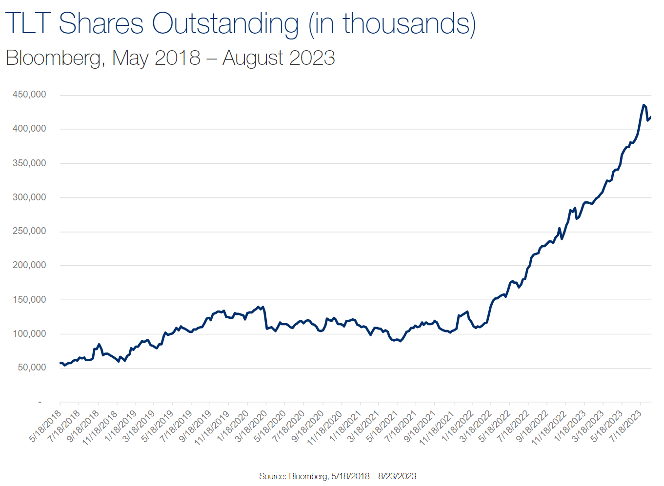- TLT shares outstanding have risen by 260%, aka ~300mm shares since the Fed started raising rates in March 2022. Comparatively, shares outstanding in SPY and QQQ are only +1-2%.